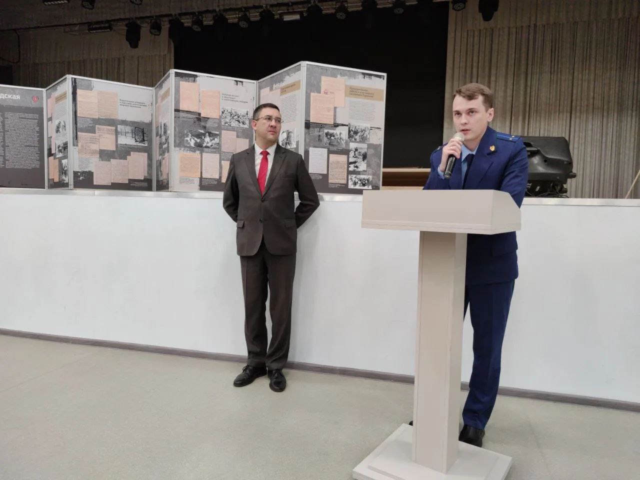 В ходе выступления работником прокуратуры до присутствующих доведена информация о судебном акте, постановленном Волгоградским областным судом по иску прокуратуры региона о признании военными преступлениями и преступлениями против человечности, геноцидом советского народа установленных и вновь выявленных преступлений, совершенных немецко-фашистскими захватчиками и их пособниками на оккупированной в период с июля 1942 г. по февраль 1943г. территории. Также помощник прокурора рассказал о проводимой прокуратурой работе по сохранению исторической памяти о Великой Отечественной войне, патриотическому воспитанию подрастающего поколения, деятельности поискового отряда из числа работников надзорного ведомства имени прокурора Сталинградской области С.В. Бекедова.