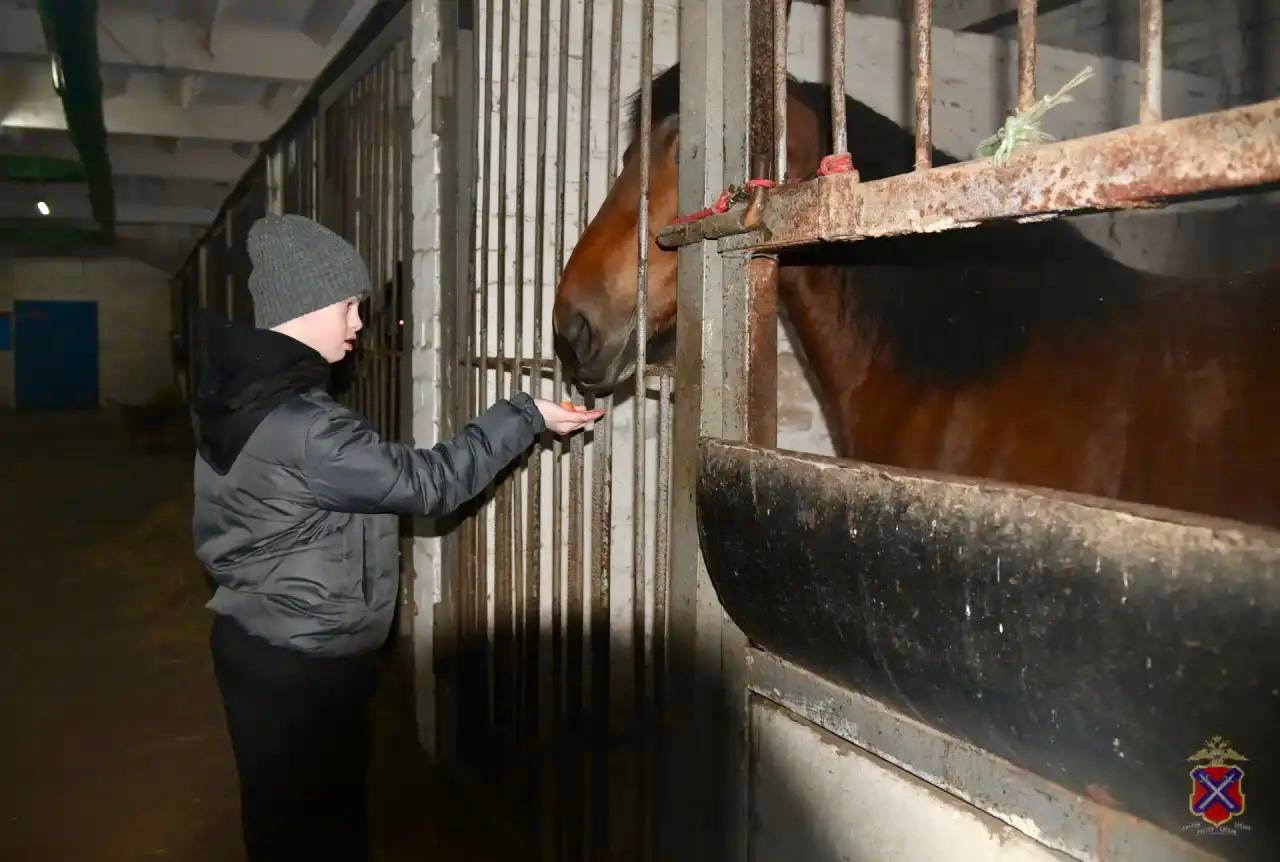 Но на этом сюрпризы не закончились. Приятным бонусом для подростка стала возможность покормить, погладить и прокатиться на полицейских лошадях на манеже кавалерийского взвода в составе ОБППСП УМВД России по городу Волжскому.