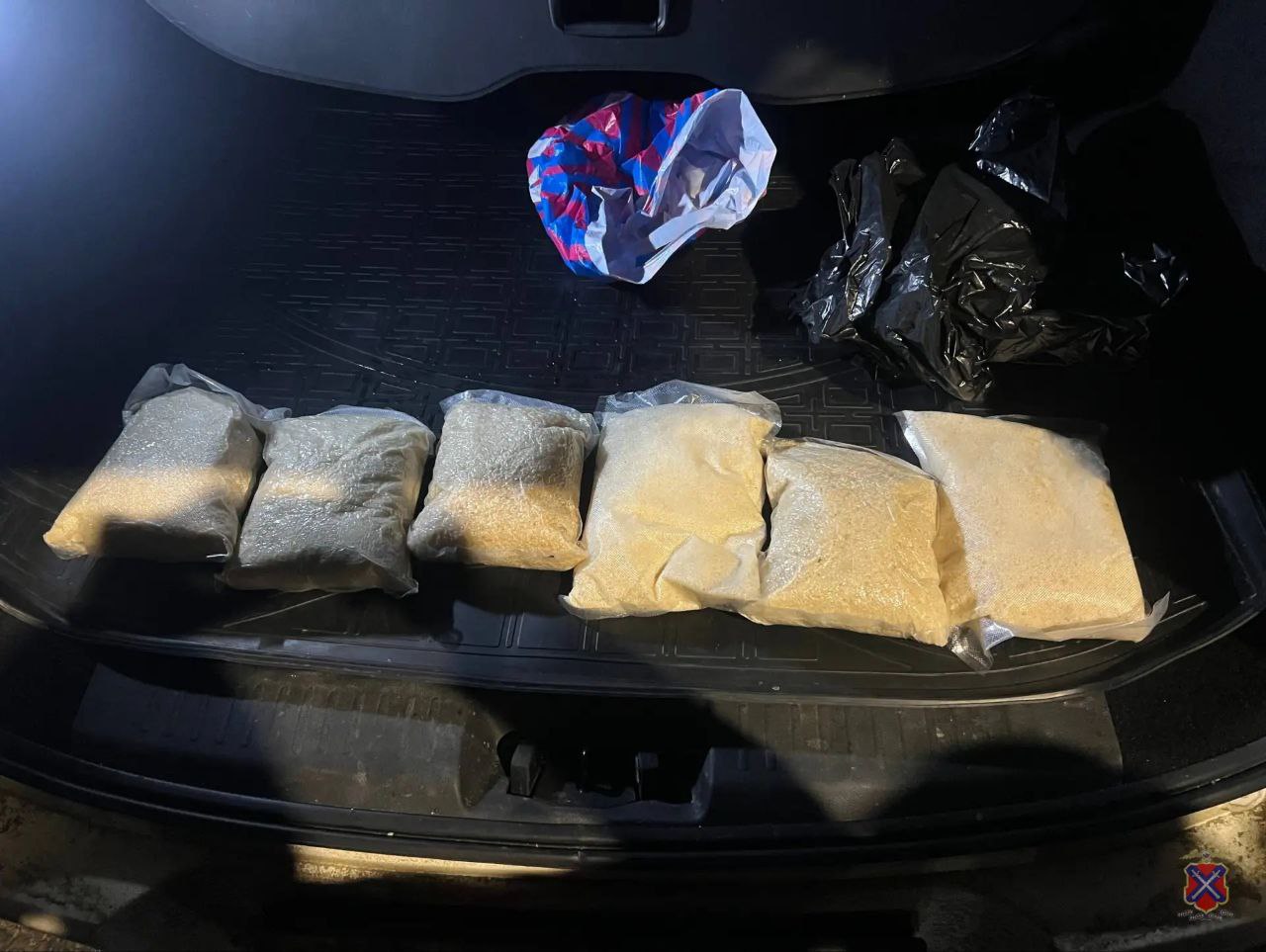 При досмотре транспортного средства в багажнике под запасным колесом полицейские обнаружили и изъяли пакет, содержащий шесть свёртков, в каждом из которых находилось порядка одного килограмма N-метилэфедрона.