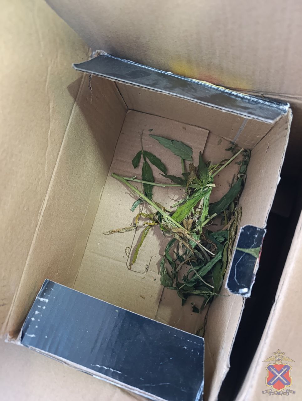 При обследовании квартиры и домовладения мужчины с применением служебно-разыскной собаки полицейские обнаружили и изъяли два свертка с веществом серо-зеленого цвета растительного происхождения, пакет с частями растений, а также коробок с растительными остатками.