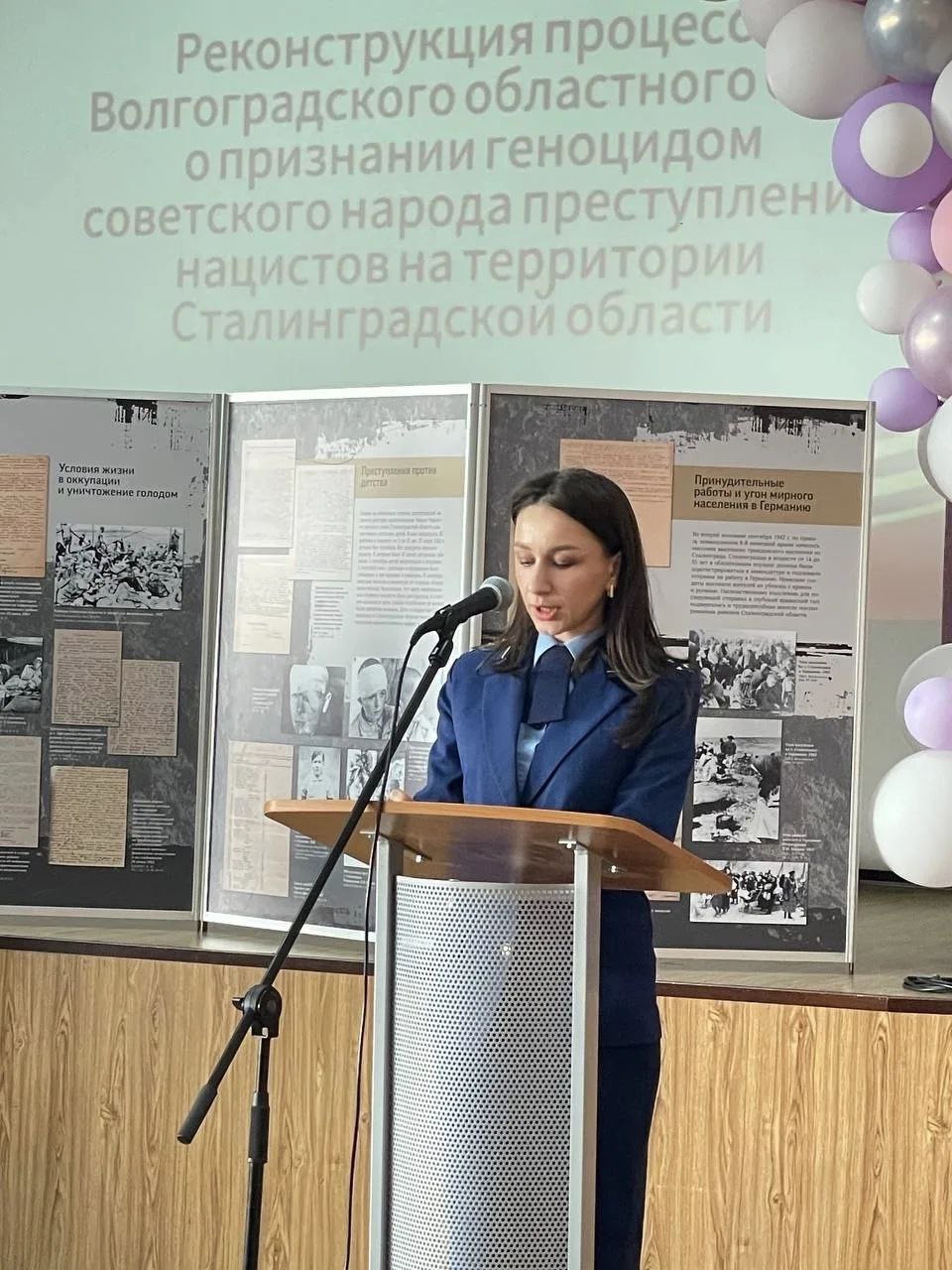 В ходе выступления работником прокуратуры до присутствующих доведена информация о судебном акте, постановленном Волгоградским областным судом по иску прокуратуры региона о признании военными преступлениями и преступлениями против человечности, геноцидом советского народа установленных и вновь выявленных преступлений, совершенных немецко-фашистскими захватчиками и их пособниками на оккупированной в период с июля 1942 г. по февраль 1943 г. территории региона. Также помощник прокурора рассказала о проводимой прокуратурой работе по сохранению исторической памяти о Великой Отечественной войне, патриотическому воспитанию подрастающего поколения.