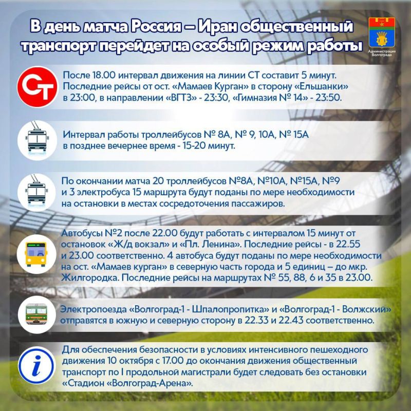 Внимание, болельщики!Дополнительный транспорт после матча 10 октябряПосле матча «Россия» – «Иран» на «Волгоград Арене» будет организован дополнительный транспорт для удобства волжан. Электропоезд от «Мамаева Кургана» до ж/д вокзала Волжского: ...