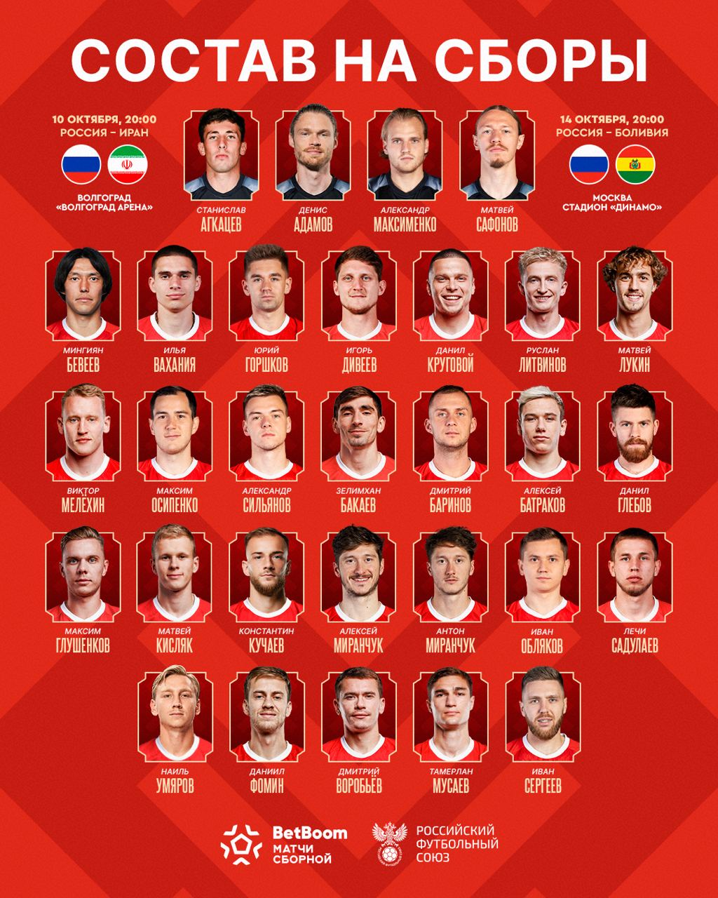 Главный тренер сборной России по футболу определил итоговый состав команды на матчи с Ираном в Волгограде и с Боливией в Москве