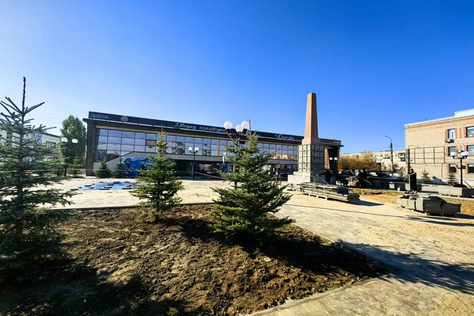 В рабочем поселке Октябрьский строители возвели металлический каркас памятника, завершили бетонные работы и приступили к облицовке стелы плиткой. Также здесь проложены подземные кабельные линии для электроснабжения, установлены закладные элементы для опор освещения и смонтировано видеонаблюдение. Продолжается укладка тротуарной плитки и монтаж новой сцены.