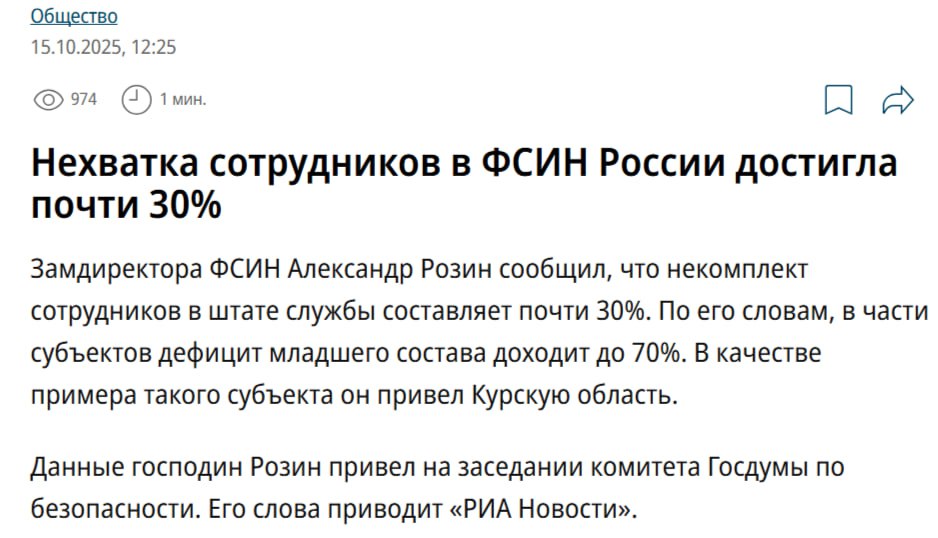 Некомплект сотрудников в штате ФСИН составляет почти 30%. В части субъектов дефицит младшего состава доходит до 70% (с) замдиректора ФСИН Александр Розин