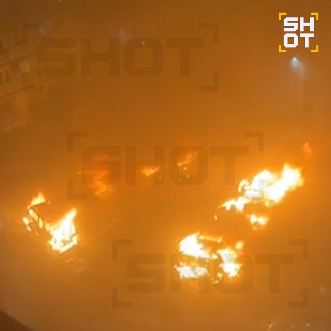 * на фото — горящие автомобили на парковке рядом с одним из жилых домов