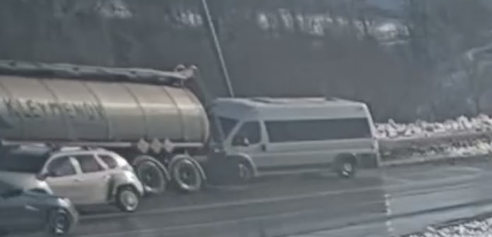 34-летний водитель микроавтобуса IRITO Boxer не справился с управлением. На всей скорости маршрутка врезалась в припаркованный грузовик MAN.