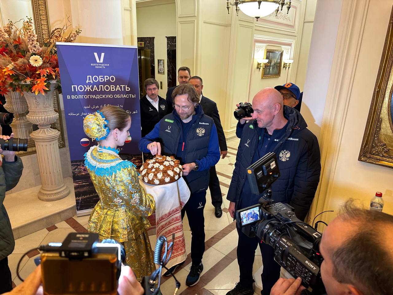 Главного тренера Валерия Карпина и игроков команды встретили традиционными хлебом-солью!