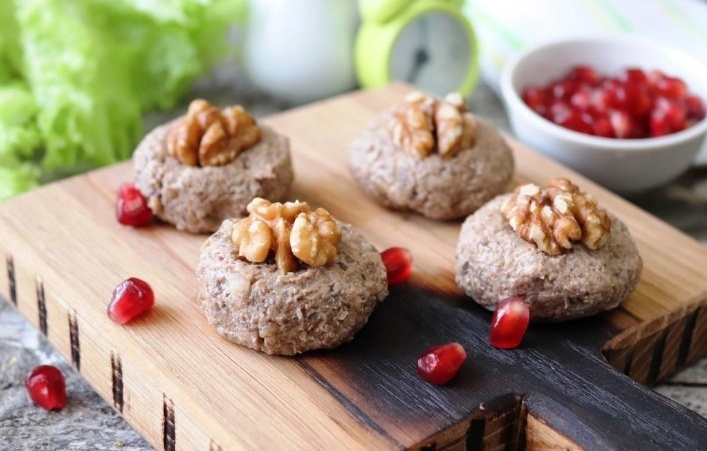 Когда паста готова, её стоит выложить в миску и добавить по вкусу соль, сахар и уксус. Чеснок нужно выдавить и хорошо перемешать. Оптимальное время для настойки — 2-3 часа. После этого можно формировать из массы маленькие шарики, которые легко сплюснуть. Для красоты их украсить грецким орехом, гранатовыми зернами или свежей зеленью.