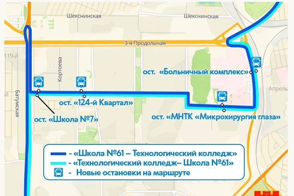 из Краснооктябрьского района автобус теперь после съезда с проезда Дорожников поедет по ул. Землячки с остановками у "Больничного комплекса" и "Микрохирургии глаза". Далее маршрут пройдет по ул. Константина Симонова в обход бульвара 30 лет Победы и части ул. Землячки и до проспекта Жукова. Добавлены остановки "124-й Квартал" и "Школа №7". По проспекту Жукова автобус доедет до Самарского разъезда, развернется и проследует к "Технологическому колледжу".
