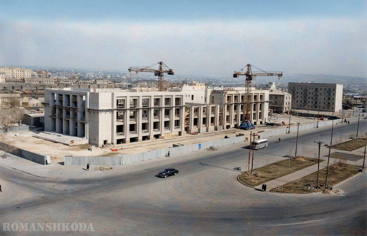 На фото - строительство Дома офицеров на площади им. В.И. Ленина. Здание строилось в период с 1958 по 1965 год по проекту архитектора Владимира Статуна и стало первым в городе представителем школы советского модернизма. Этому же архитектору принадлежит выполненный в том же стиле проект Волгоградской областной универсальной научной библиотеки им. Горького.