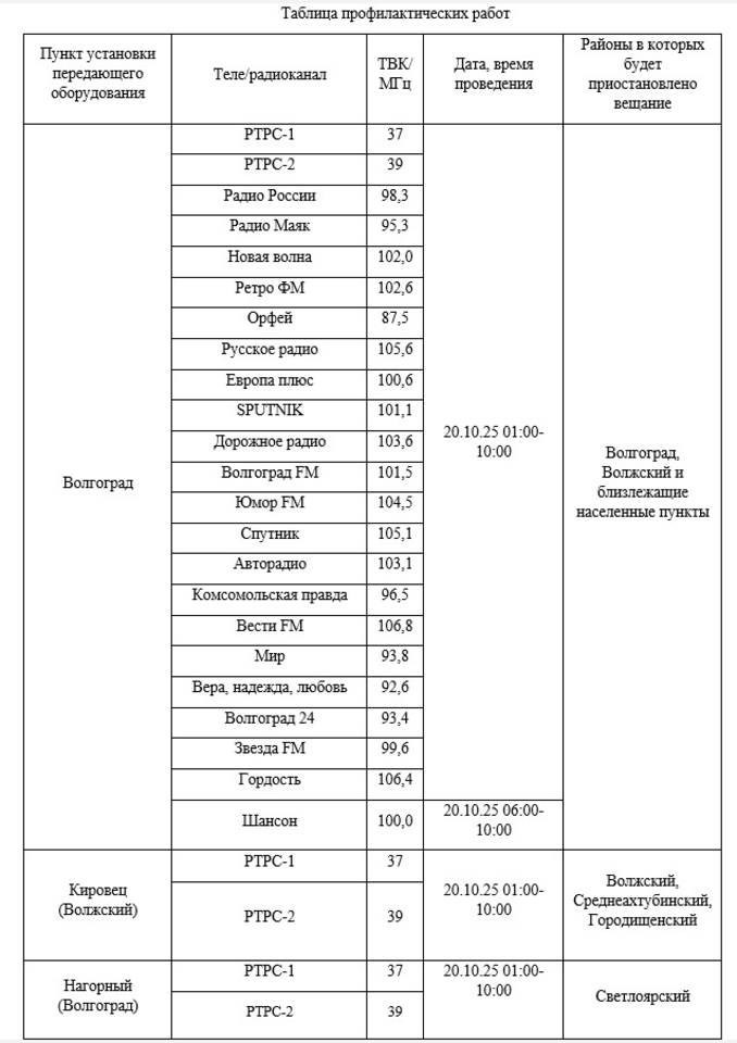 В Волгограде прервут трансляцию телерадиосигнала 20 октября.