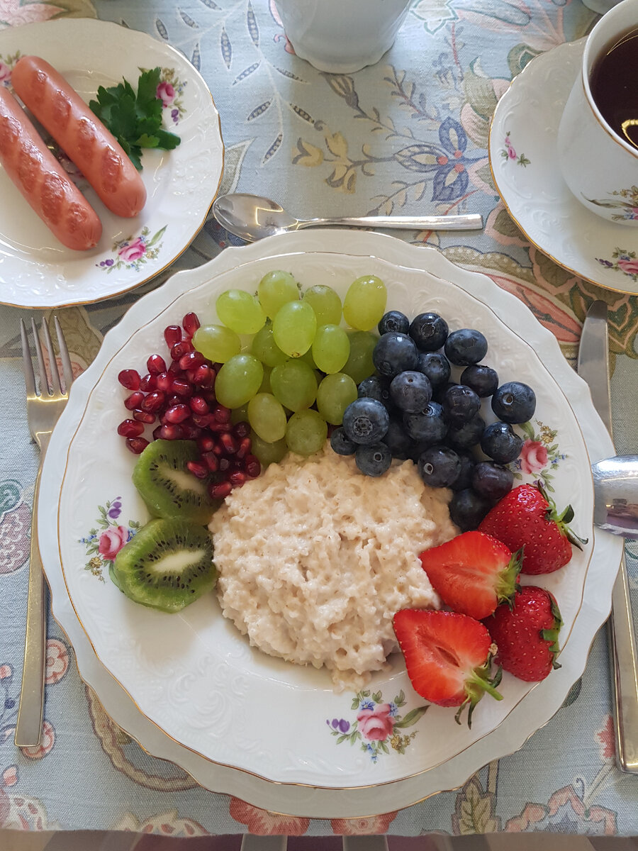 Пока готовится каша, можно разогреть электрический гриль до 200 градусов Цельсия и выложить на него колбаски. Жарить их нужно около пяти минут до золотистой корочки. После этого самое время заняться ягодами: их следует тщательно промыть, чистить киви от кожуры, а гранат освободить от семян.