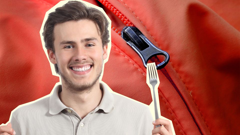 Даже не пытайтесь починить бегунок голыми руками — сразу берите вилку. Зафиксируйте ее и наденьте «собачку» на два внутренних зубца узкой стороной.