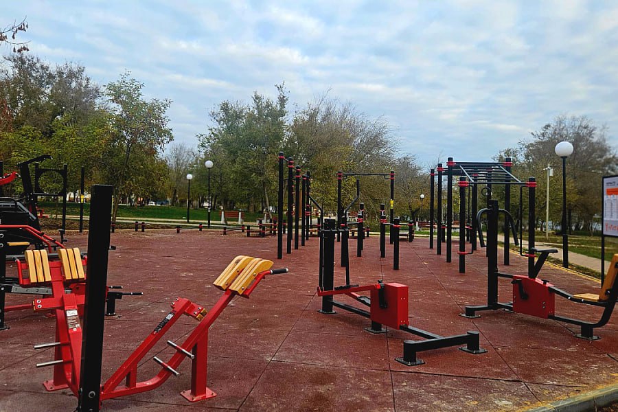 Установлены тренажеры для различных групп мышц, каскад турников для воркаута, мишень для метания, велотренажеры, уголок для занятий гиревым спортом, рукоход, «шведская стенка», гимнастические брусья, специальные скамьи и другое. В таком комплексе могут заниматься физкультурой жители всех возрастов.