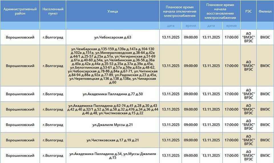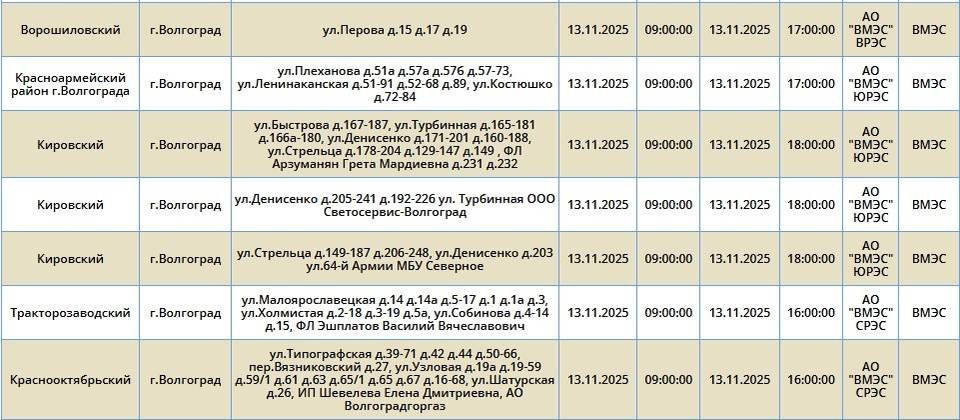 В четверг, 13 ноября, отключение электроэнергии ожидается в четырех районах Волгограда. Света не будет в Ворошиловском, Красноармейском, Кировском и Тракторозаводском районах. Об этом сообщает компания «Россети Юг».