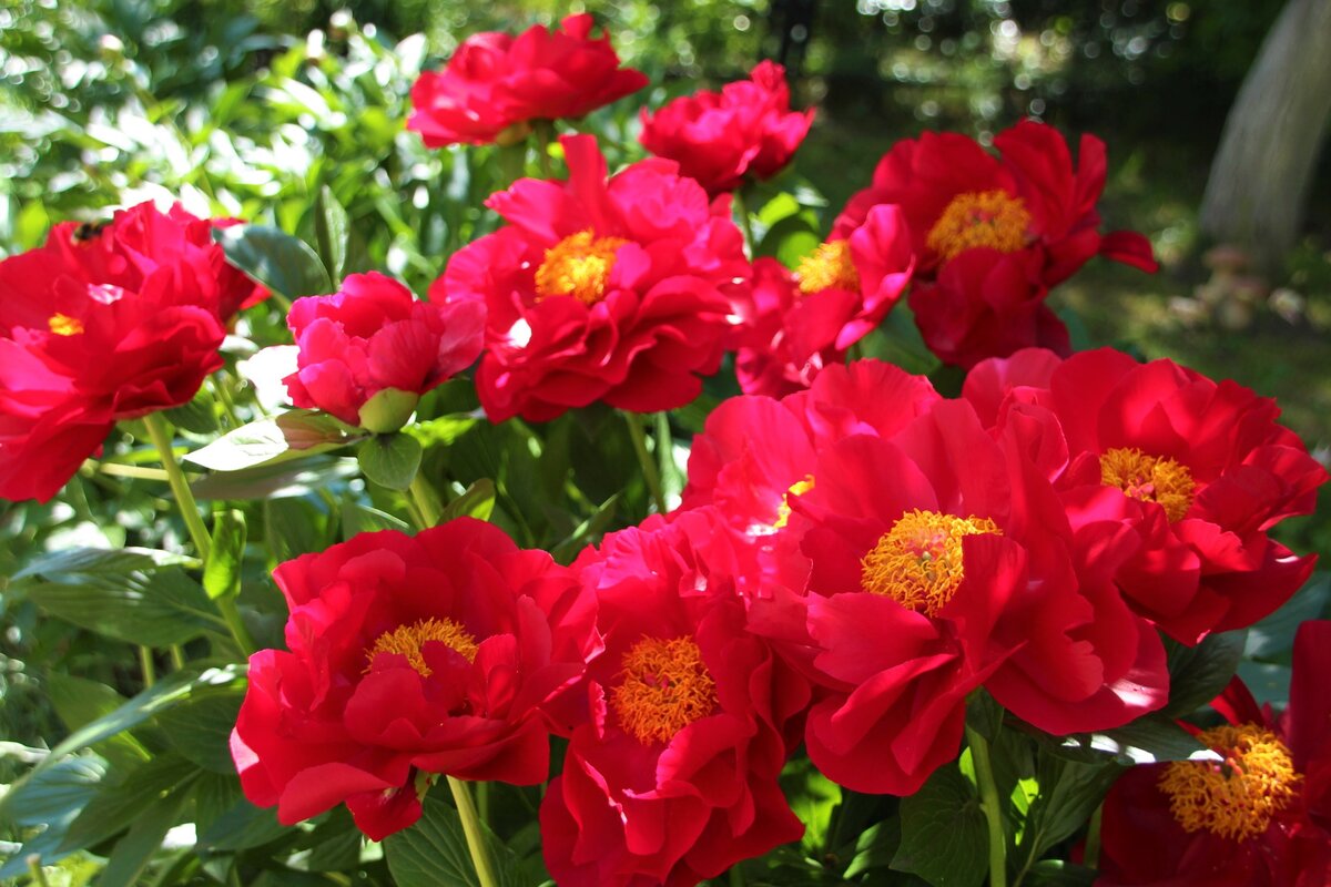 Цветки этого пионовидного сорта удивляют своим размером — до 18 см в диаметре. Лепестки ярко-алые, атласные, расположенные в три ряда, окружают чашу с золотыми тычинками. Они выглядят как розы, даря саду особое очарование и изящество. В некоторые годы можно заметить даже игривый красный хохолок в середине венчика, что добавляет некую оригинальность к общей эстетике.