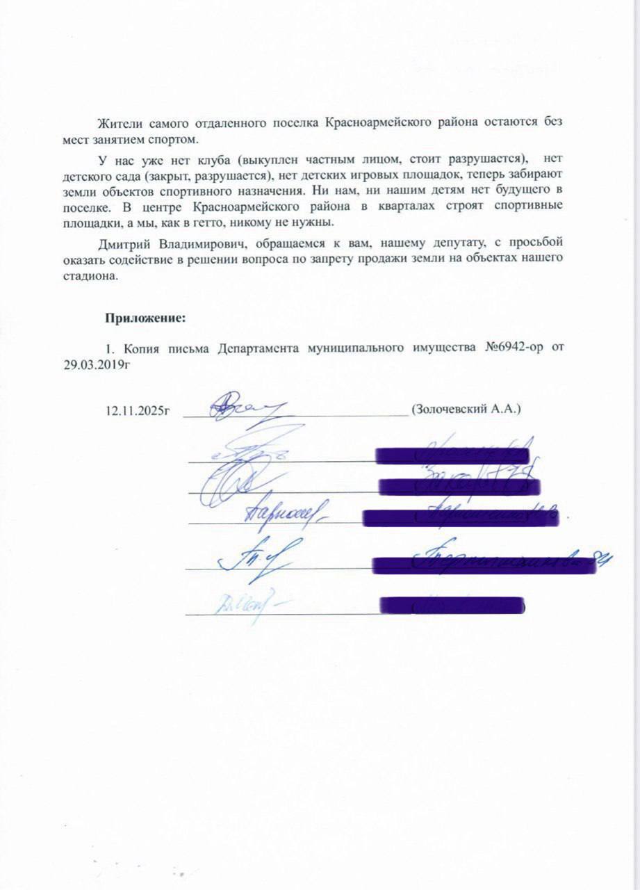Жители самого отдаленного посёлка Красноармейского района остаются без мест для занятия спортом. В своем обращении заявители просят разобраться в законности выделения земельных участков под ИЖС на месте пусть и бывших, но спортивных сооружений.