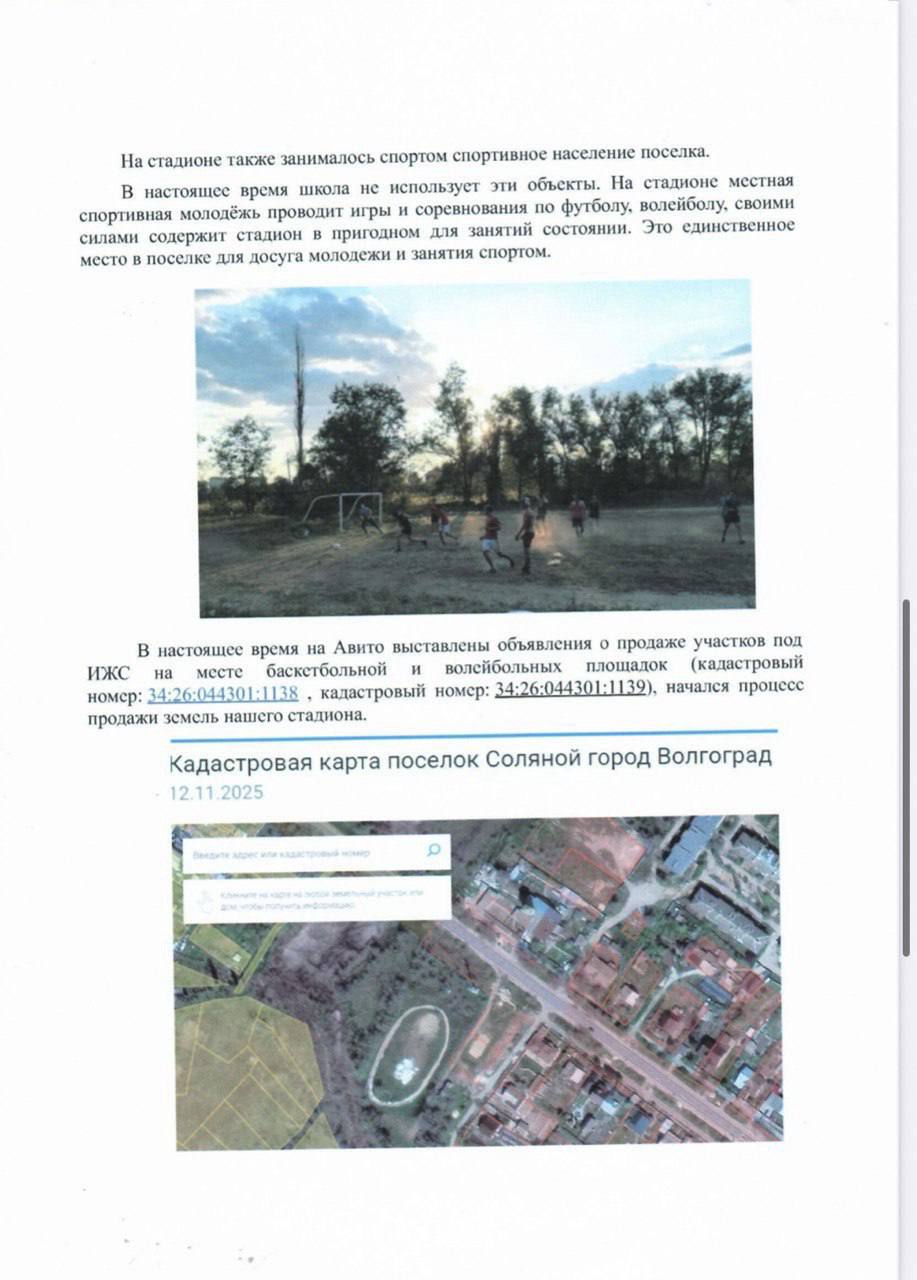 В настоящее время в интернете, на ресурсе «Авито» размещены объявления о продаже участков под индивидуальное жилое строительство на месте баскетбольной и волейбольных площадок (кадастровый номер: 34:26:044301:1138, кадастровый номер: 34:26:044301:1139), начался процесс продажи земель на месте стадиона.