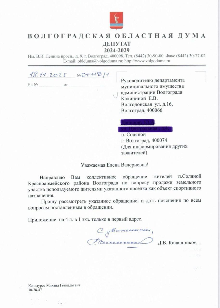Мной уже подготовлено обращение в адрес руководителя департамента муниципального имущества администрации города Волгограда с требованием дать чёткие пояснения по законности выделения этих земель под застройку.