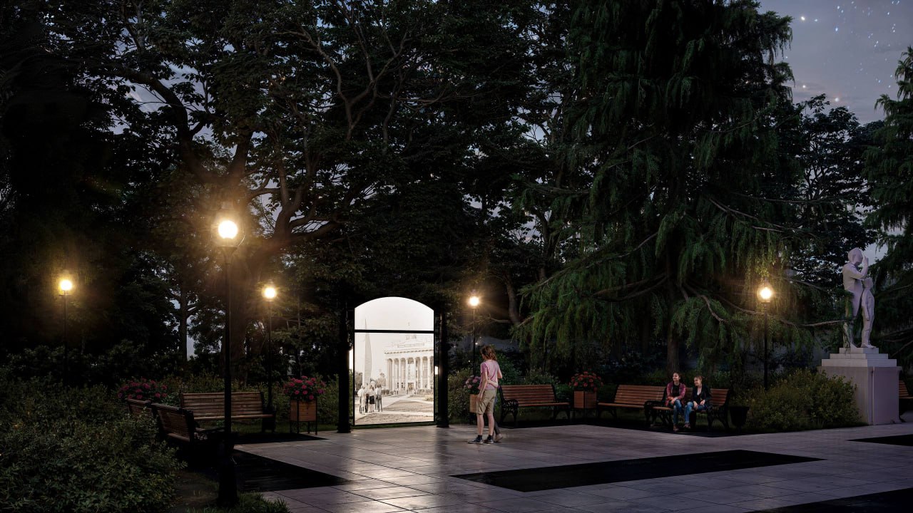 Задача - добавить в парк ряд открытых и доступных зон, которые будут наглядно показывать этапы строительства города. Разбивая время на декады ( 50-ые, 60-ые, 70-ые, вплоть до 2020-ых годов) через физические модели (скульптуры), добавляя возможность использовать VR и AR-технологии для современного восприятия. Зоны отделены друг от друга и расположены по периметральной аллее парка начиная от центрального входа против часовой стрелки.