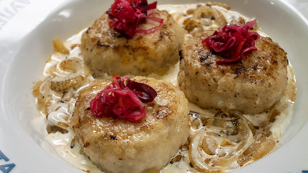 Перед подачей на стол смазываем дно тарелки сметаной, выкладываем котлетки, сверху лук и посыпаем копченой паприкой.