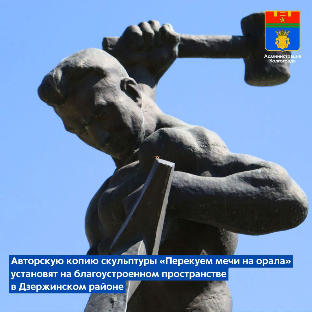 Авторская копия скульптуры Е. В. Вучетича «Перекуем мечи на орала», ранее размещавшаяся на участке у второстепенной дороге на ул. Новодвинской, будет установлена на оживленном благоустроенном общественном пространстве по пр-кту им. Маршала Жукова, вблизи МОУ «Центр детского творчества Дзержинского района Волгограда». Подрядная организация уже начала подготовительные мероприятия.