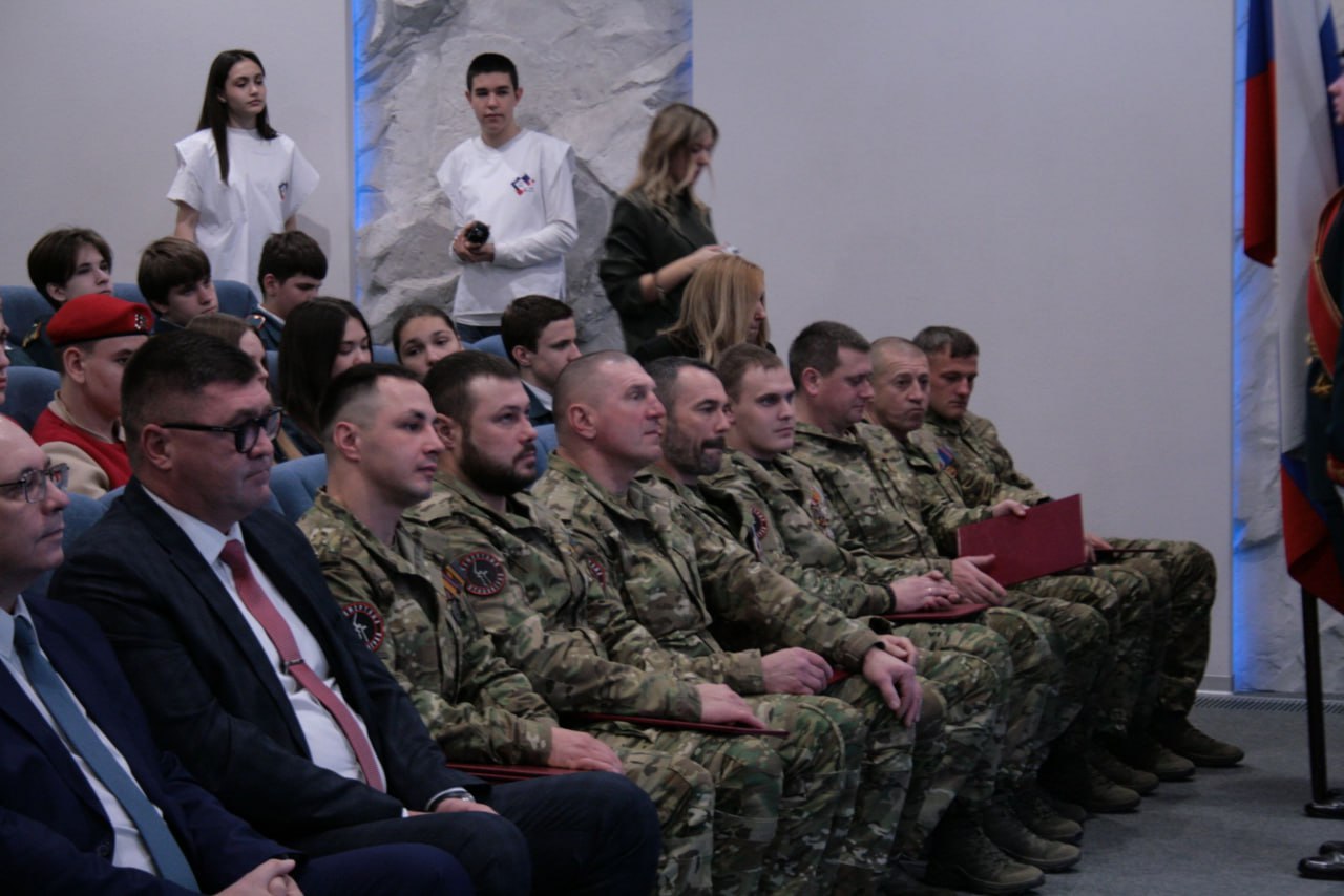 Председатель городского Совета ветеранов Александр Струков, заместитель главы Волгограда Анна Кувычко и вице-спикер Волгоградской городской Думы Геннадий Кузнецов вручили награды волонтерам Центра специальной подготовки «Высшая ценность», инструкторам военно-патриотического центра «Бессмертный Сталинград» и директору центра, депутату гордумы Михаилу Харитонину.