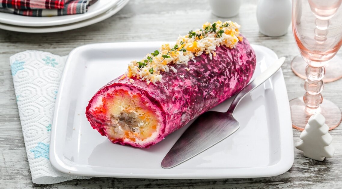 Готовый рулет не только удивит гостей своим оригинальным видом, но и порадует их вкусовыми качествами! Такой подход к классике отлично украсит праздничный стол. А какие ваши любимые версии новогодних салатов? Поделитесь в комментариях!