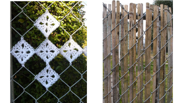 - Самодельная «вышивка» – зайдя в мир творчества, забор может стать настоящей художественной галереей. С помощью цветных лент, пластиковых стаканчиков или даже вязания на сетке, ваши заборы получат совершенно новый вид.