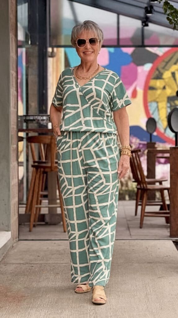 - Брючный костюм из легких тканей — идеальный выбор для теплых дней. Можно смело экспериментировать с принтами. Выбирая свободные брюки и блузку на запах, можно создать непринужденный и элегантный стиль.