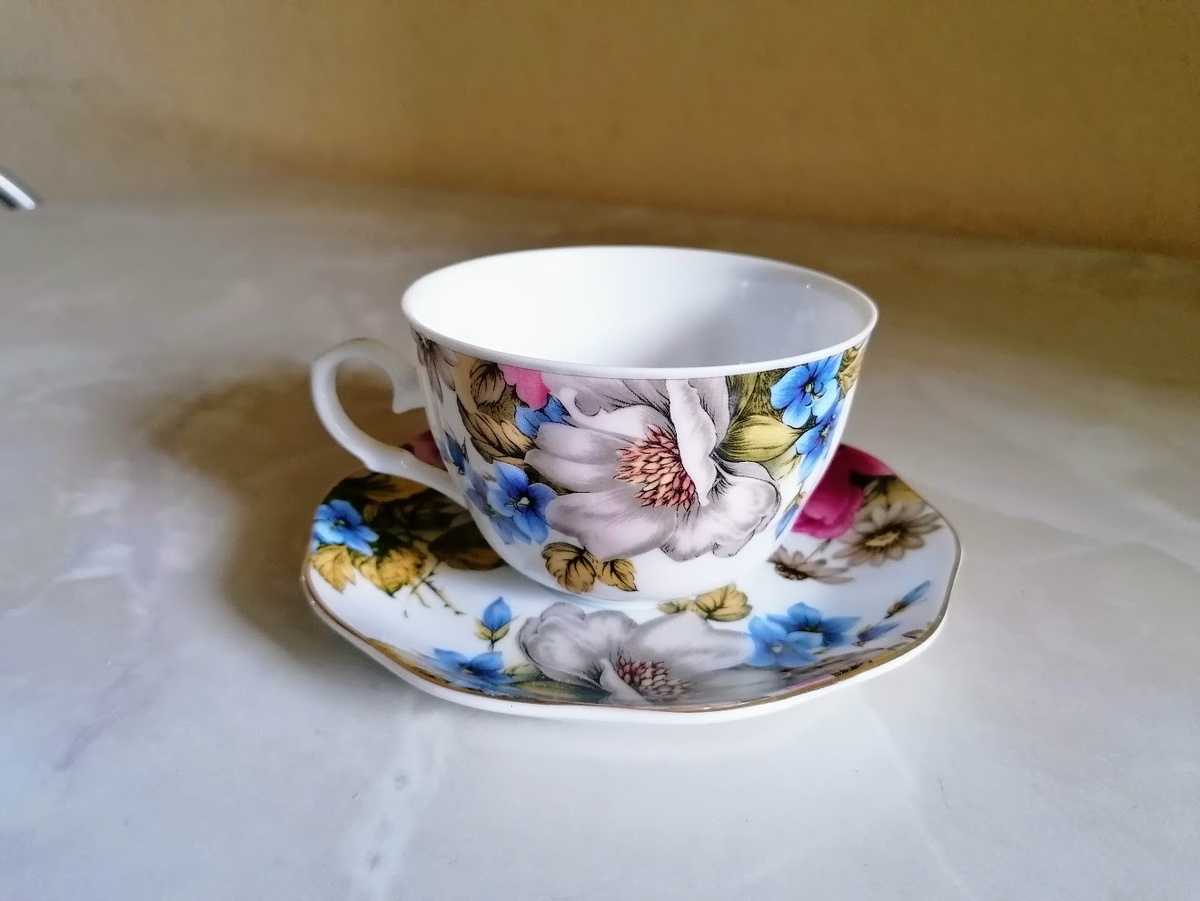 Эта уникальная чайная пара, выполненная из тонкого фарфора, поражает своей красотой. На ней изображены великолепные цветы, каждый лепесток словно живет своей жизнью. Чашка и блюдце были приобретены около 30 лет назад и относятся к японскому сервизу, отмеченному позолотой в 24 карата. Каждое использование этой пары превращает простой чай в изысканный ритуал.