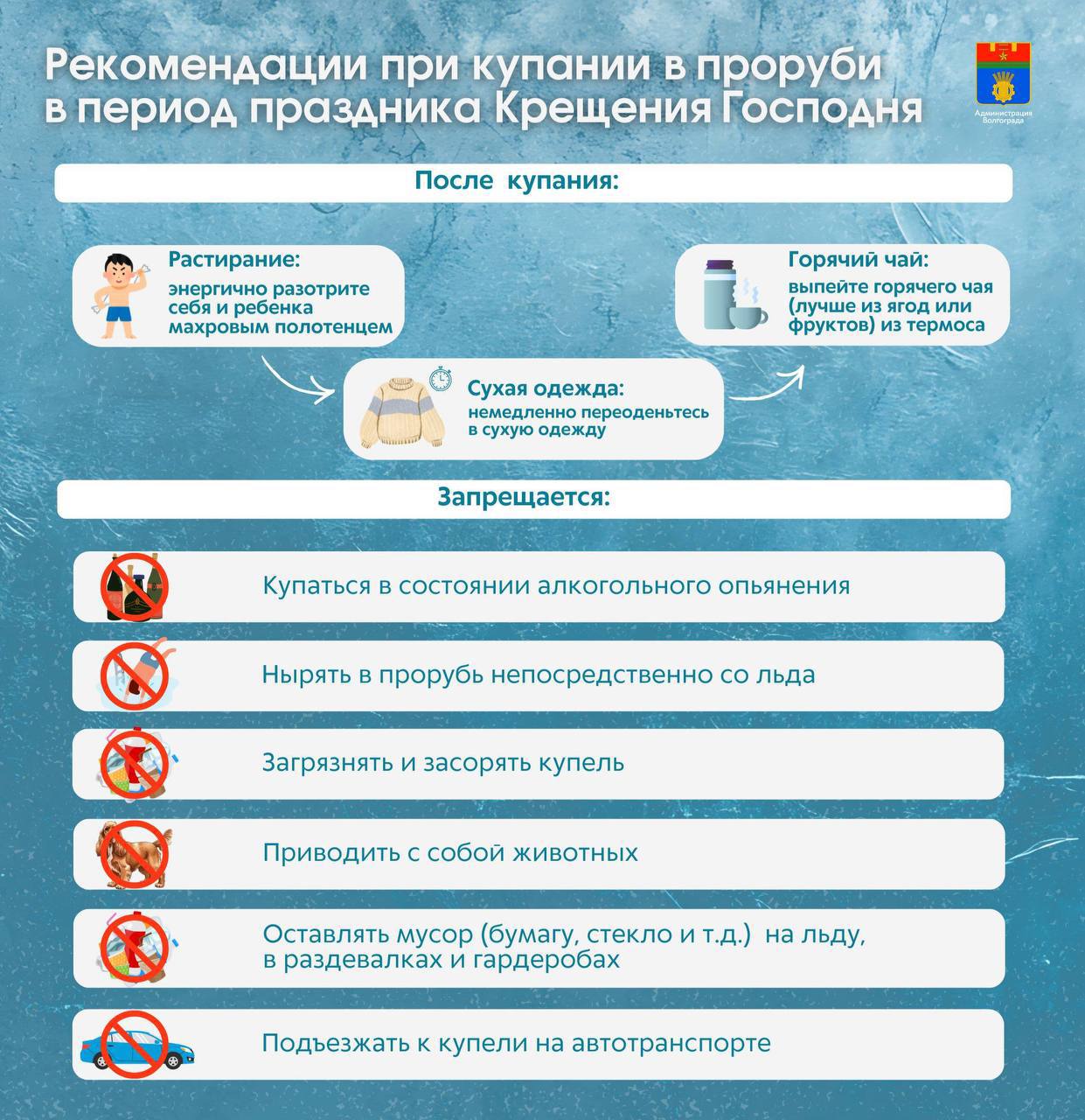 Муниципальные районные предприятия ЖКХ устанавливают возле каждой купели тёплые палатки для переодевания, чтобы участники могли согреться после выхода из воды и минимизировать риск переохлаждения. Также организуют удобные и безопасные спуски к воде.