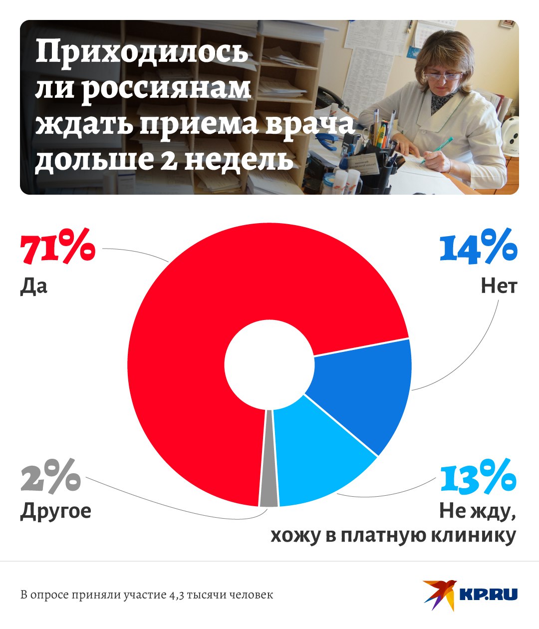 KP.RU: 71% опрошенных пожаловались, что иногда ждут прием у врача дольше 14 дней