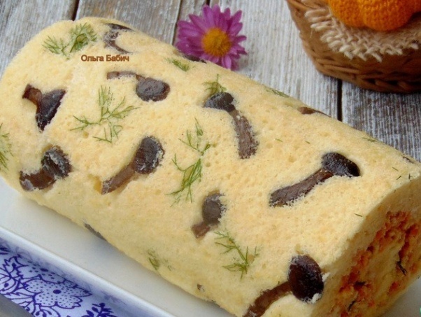 По завершении выпечки, рулет следует перевернуть на кухонное полотенце и аккуратно снять бумагу. После этого рулет нужно скатать в рулетик так, чтобы грибы оказались внутри, и оставить остывать.