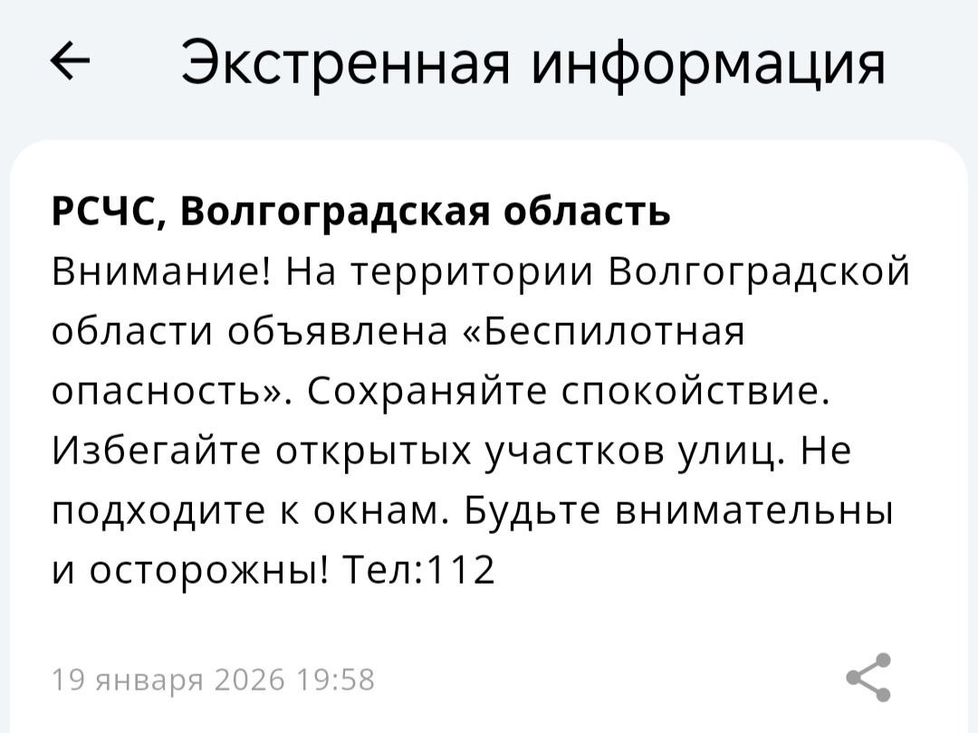 РСЧС сообщает о беспилотной опасности в Волгоградской области