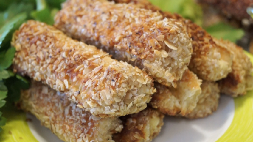 Каждый рулеток обмакивают в яичную массу, затем в хлопья. Обжаривают на сковороде с небольшим количеством масла до золотистой корочки с обеих сторон.
