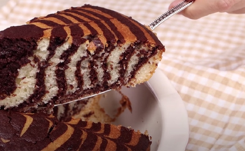 Для создания полосатого рисунка разделите тесто на две части. В одну добавьте немного муки, а в другую — какао. Выложите тесто в форму, чередуя светлое и темное, что и создаст знаменитый узор "Зебры". Важно выкладывать тесто по центру, чтобы узор вышел ровным.