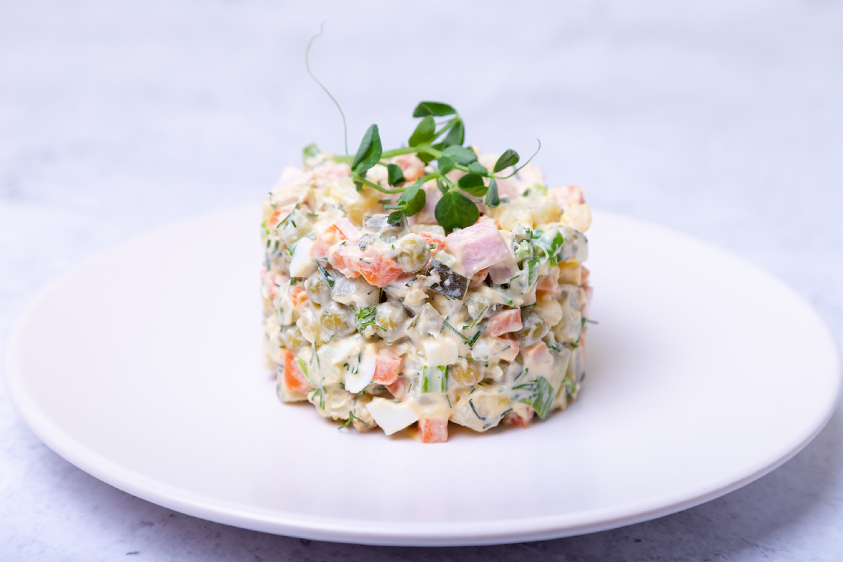 Классический салат можно адаптировать так, чтобы он стал «синбиотиком» для кишечника. В качестве основы — охлаждённые овощи: картофель, морковь, горошек, лук и огурцы — они богаты устойчивым крахмалом, пектином и пребиотическими волокнами. Замена колбасы на нежирное мясо или морепродукты и сметана вместо майонеза превращают блюдо в полезную композицию, где кисломолочные культуры добавляют пробиотики, поддерживающие баланс микробиоты.