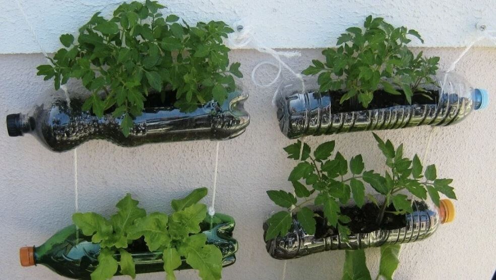 Подвесные кашпо из бутылок — ещё один способ задействовать вертикаль. Бутылку подвешивают за верёвки, выращивают базилик, мяту и декоративные растения. Важно выбирать матовые или цветные бутылки: они меньше требуют внимания к водорослям и выглядят эстетично.