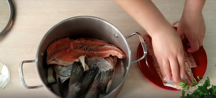 Сначала в большую кастрюлю кладут рыбий набор и заливают водой. Варят примерно 35–40 минут на среднем огне, пену снимают по мере образования. Затем бульон процеживают, а само рыбное содержимое откладывают в сторону.