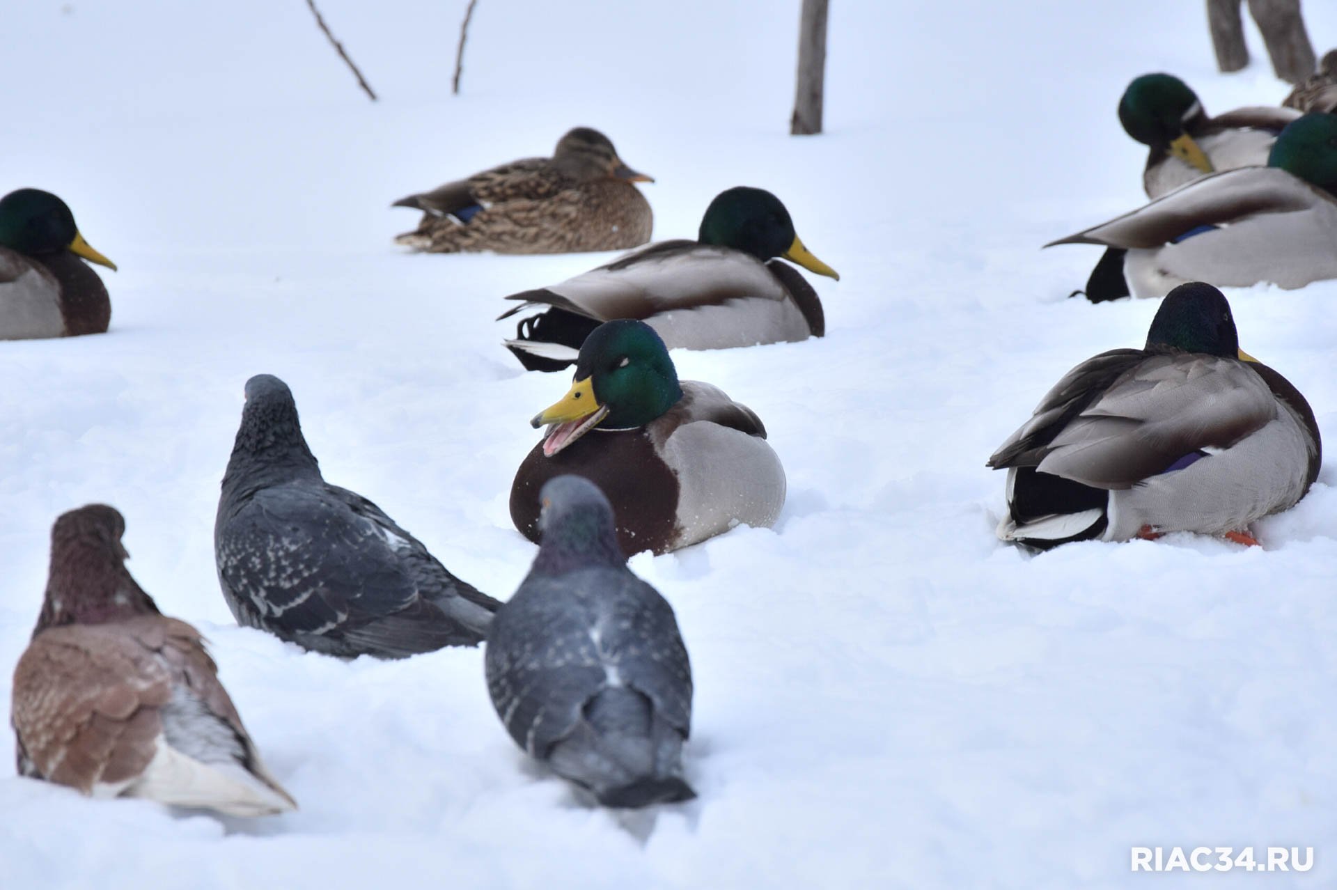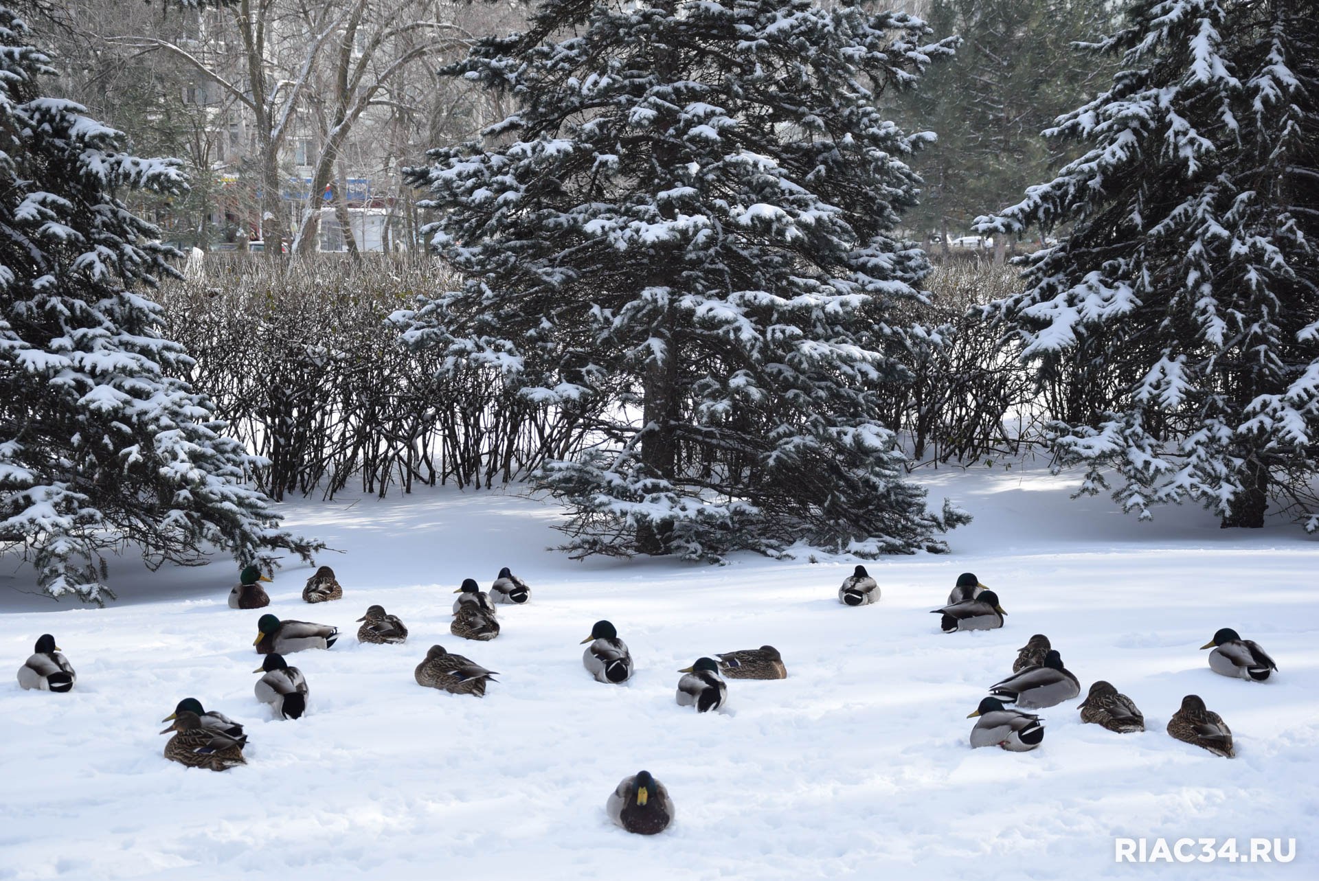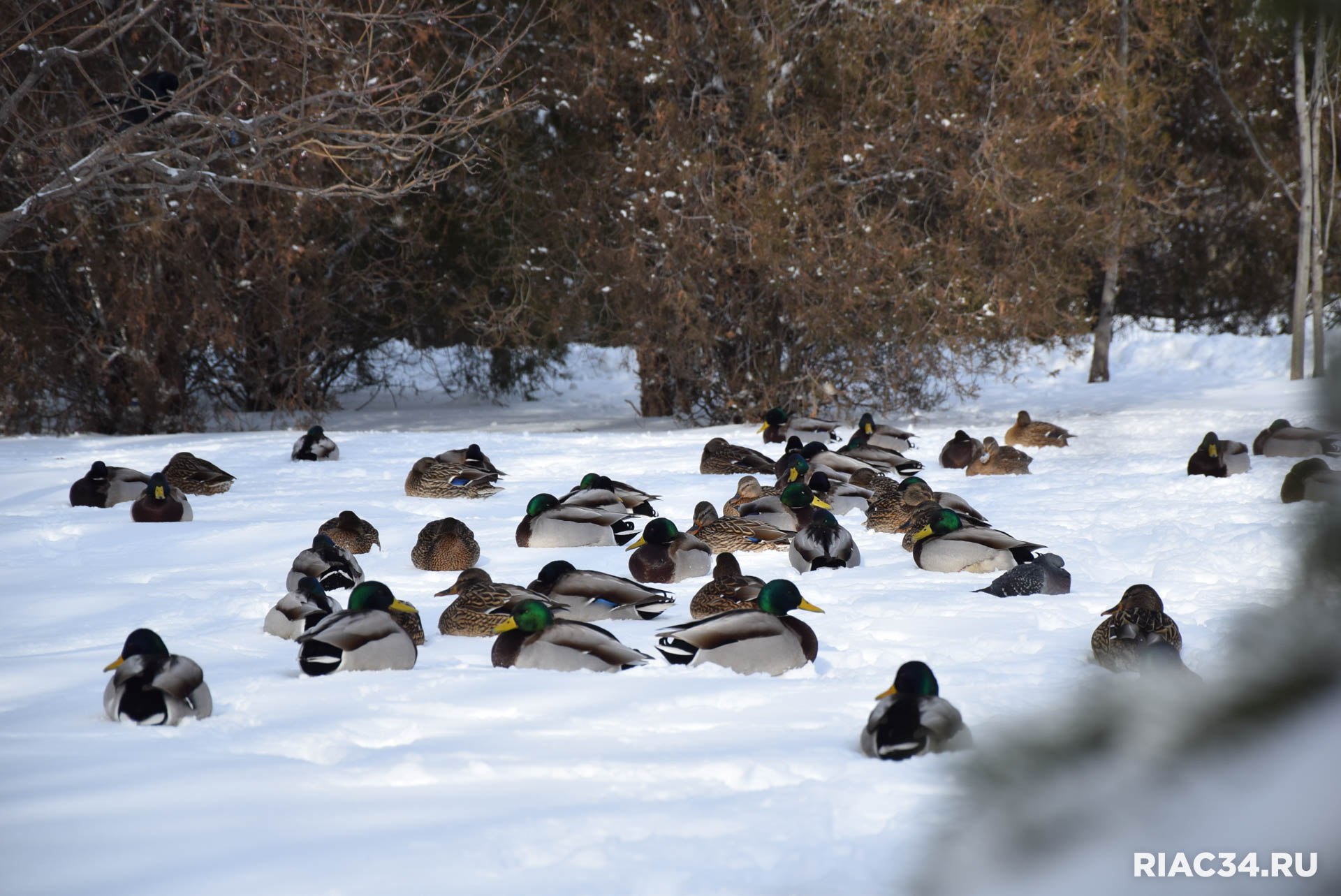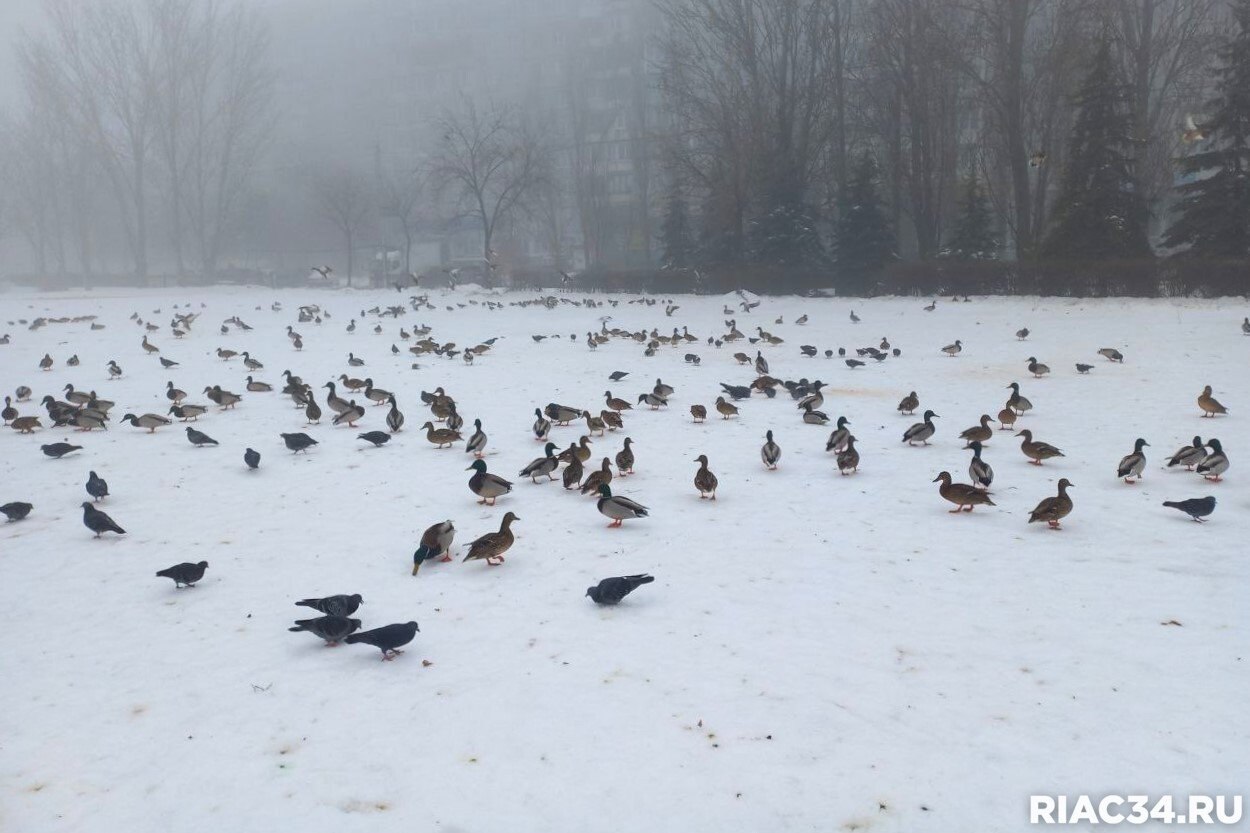 В заснеженном Семейном парке на Семи ветрах в Дзержинском районе Волгограда гостит большая стая уток