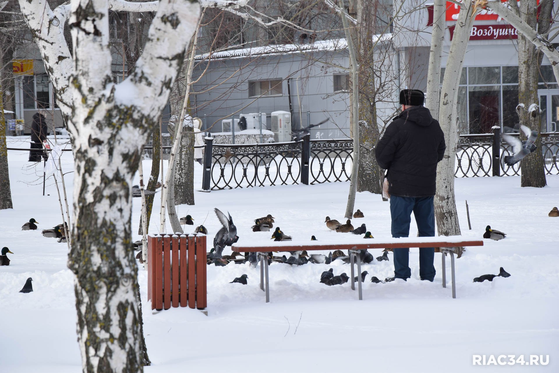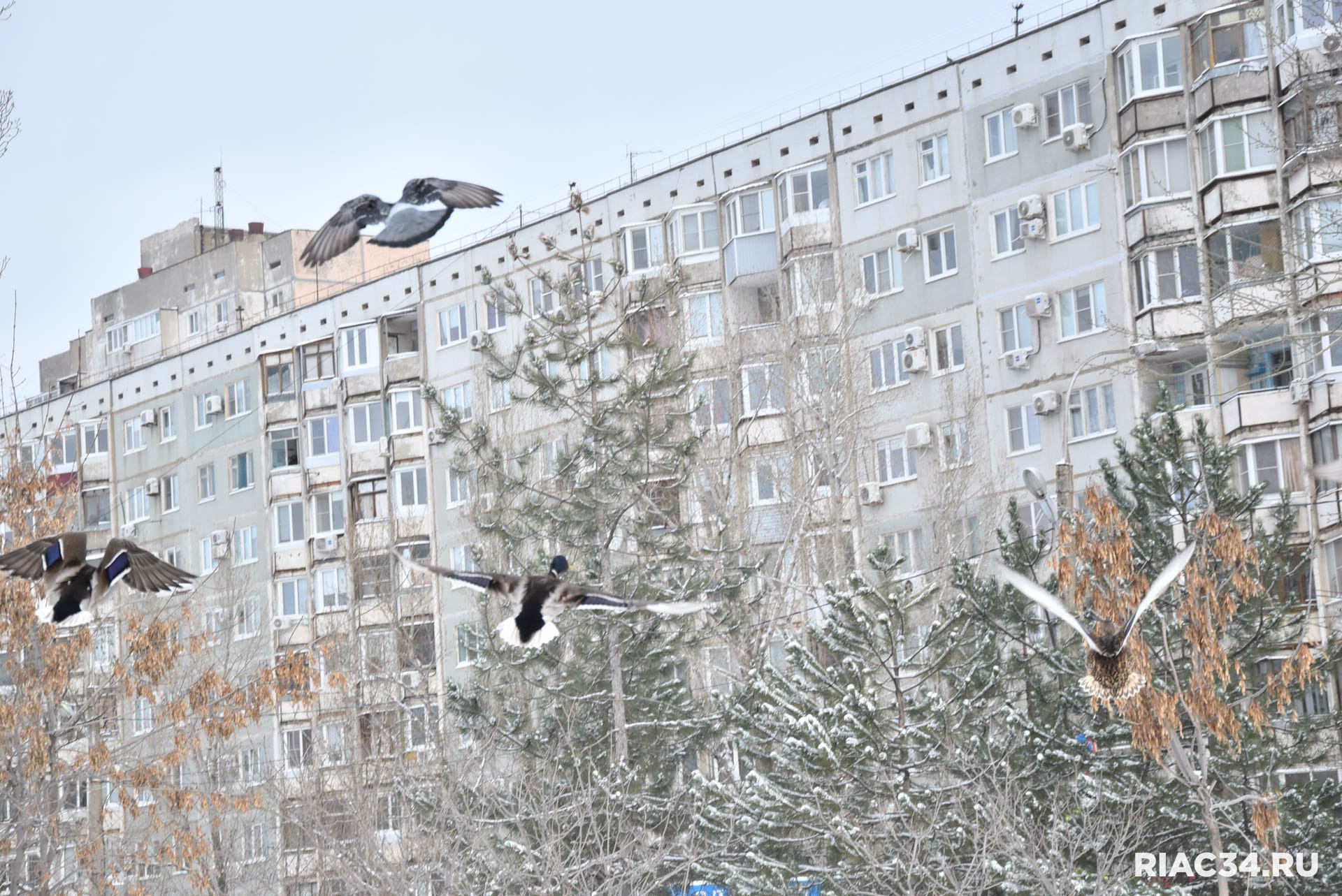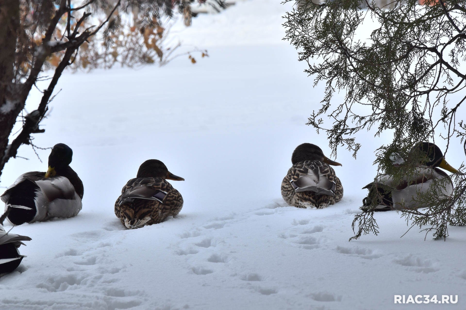 В заснеженном Семейном парке на Семи ветрах в Дзержинском районе Волгограда гостит большая стая уток