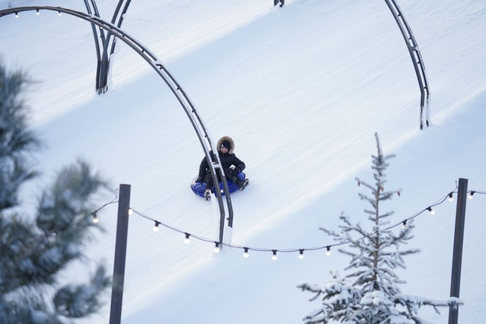 Протяженность спуска на тюбинге составляет порядка 80 метров. Время работы – с 10:00 до 22:00.