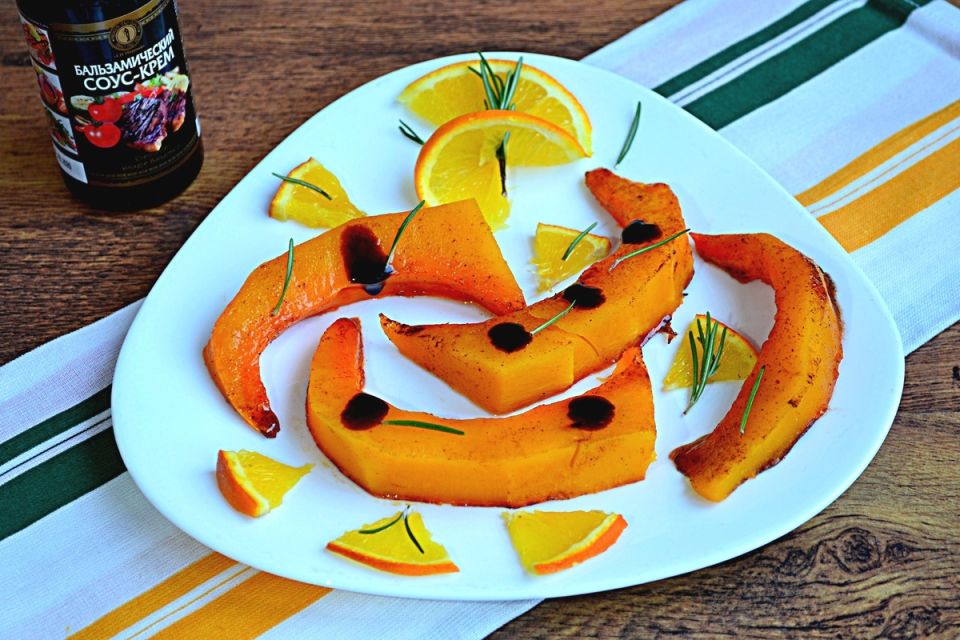 Готовую тыкву полейте медом и подавайте на стол. Также можно охладить и наслаждаться в холодном виде. Этот десерт с румяной карамельной корочкой порадует всех за столом! Любители бальзамика могут дополнить блюдо соусом для особого вкусового акцента.