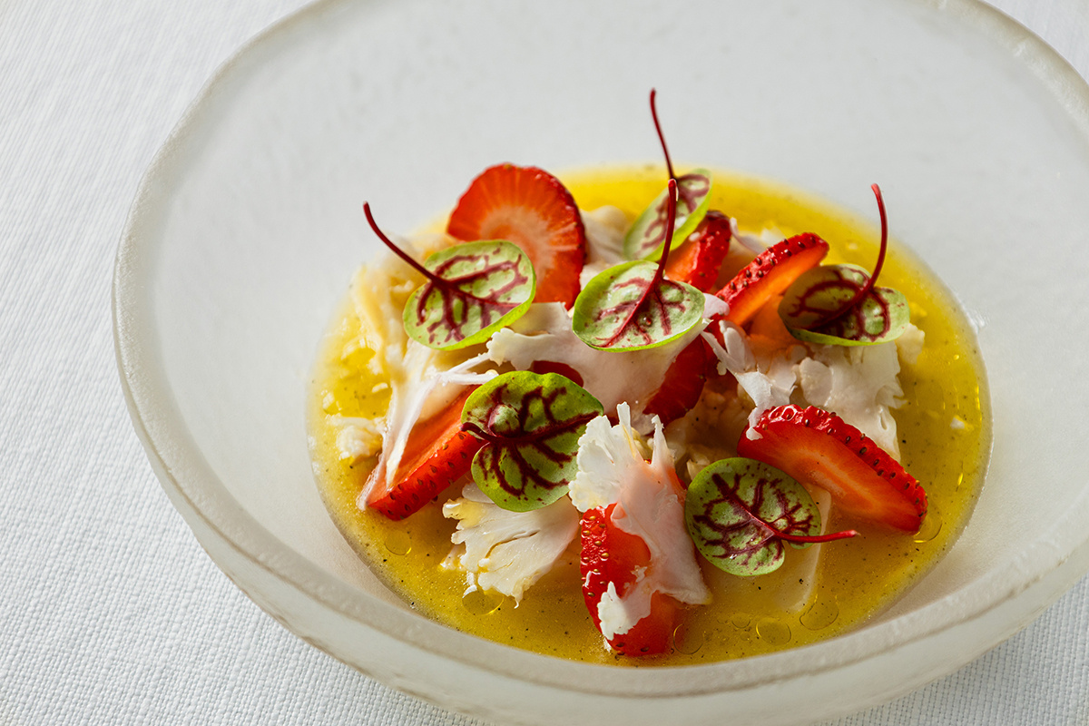 - Севиче из гребешка с клубникой и цветной капустой: Нежный гребешок подается с маринованным имбирем и сладкой клубникой, а также отварными соцветиями цветной капусты. Это изысканное блюдо гармонично комбинирует свежесть и текстуру, создавая яркие вкусовые акценты.