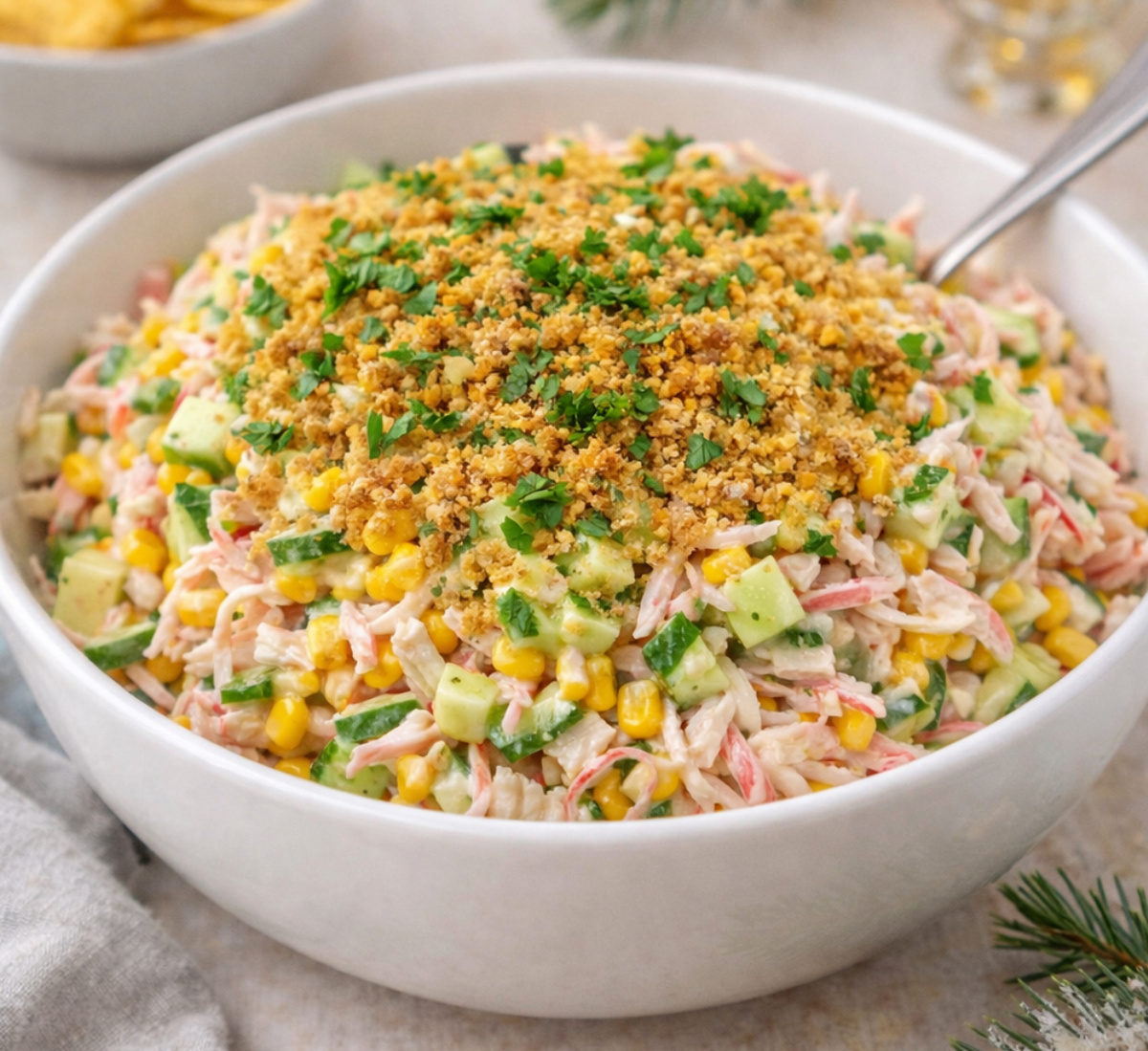 Если обычно крабовые палочки смешивают с привычными ингредиентами, здесь текстура и баланс начинают задавать ритм. Свежий огурец добавляет ясную нотку, сыр усиливает глубину вкуса, а хрустящие сухари за пару секунд превращают каждый укус в маленькое приключение.
