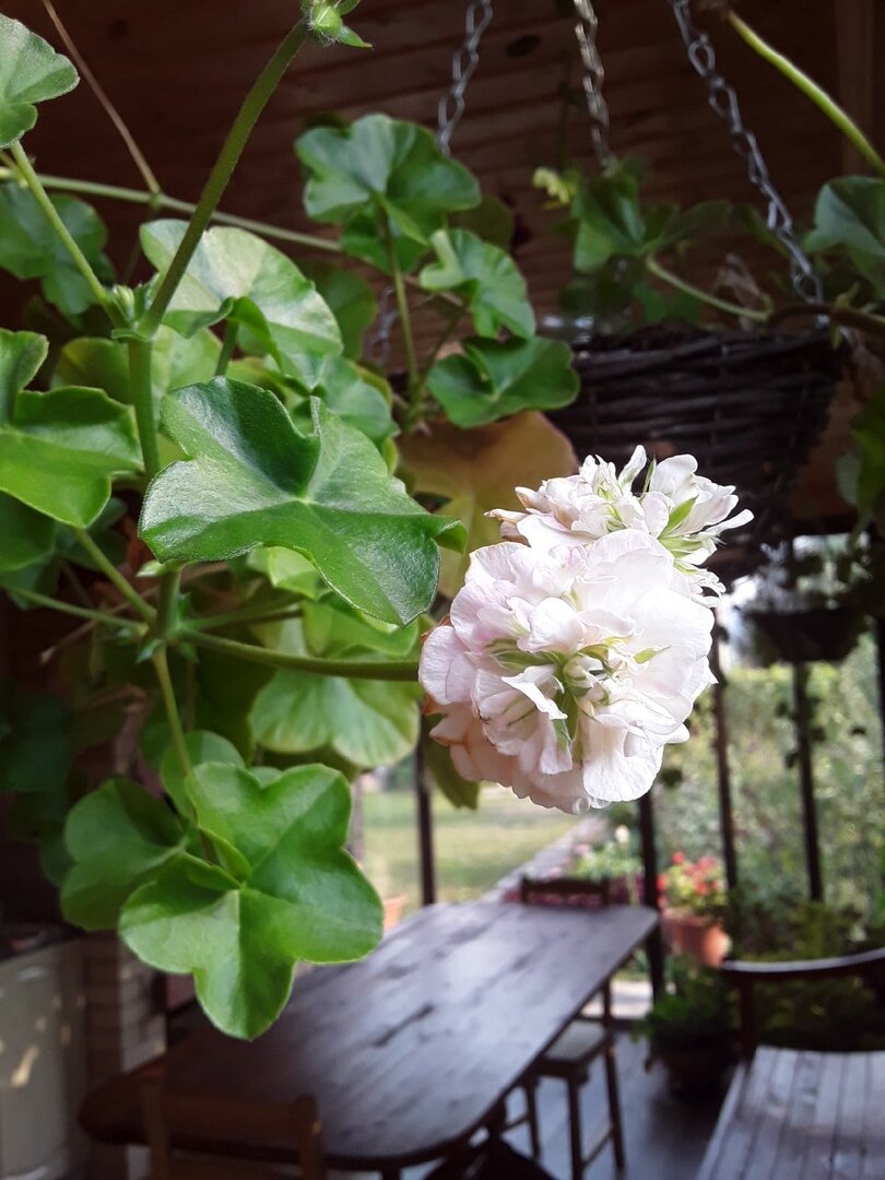 Уже второй летний сезон экспериментов над выбором идеальных растений для подвесных корзин на потолке приносит смешанные результаты. Главная проблема заключается в том, что веранда расположена с западной стороны, где весной и в начале лета достаточно света, а позже ее затеняет виноград. Это обостряет вопрос выбора растений, которые могут продолжать радовать своим видом в условиях недостатка солнечного света.