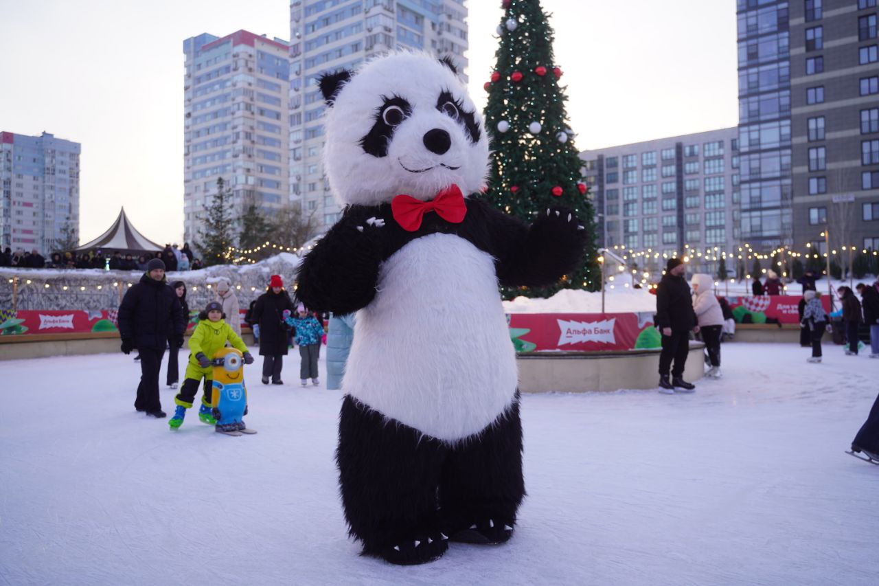 На лед катка «Лагуна» сначала вышла гигантская панда. Гости в масках дракона устроили флешмоб.