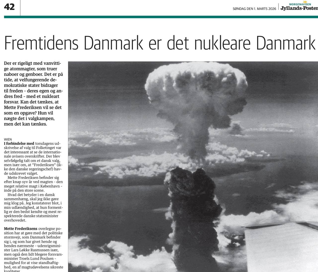 «Дания будущего - это Дания с ядерным оружием». Под таким заголовком сегодня на страницах газеты Jyllands-Posten публикует статью ветеран датской журналистики Пер Нихольм (тот самый безумец, который призывал ударить ядерными бомбами по Москве, Петербургу и Волгограду). Теперь же он пишет: